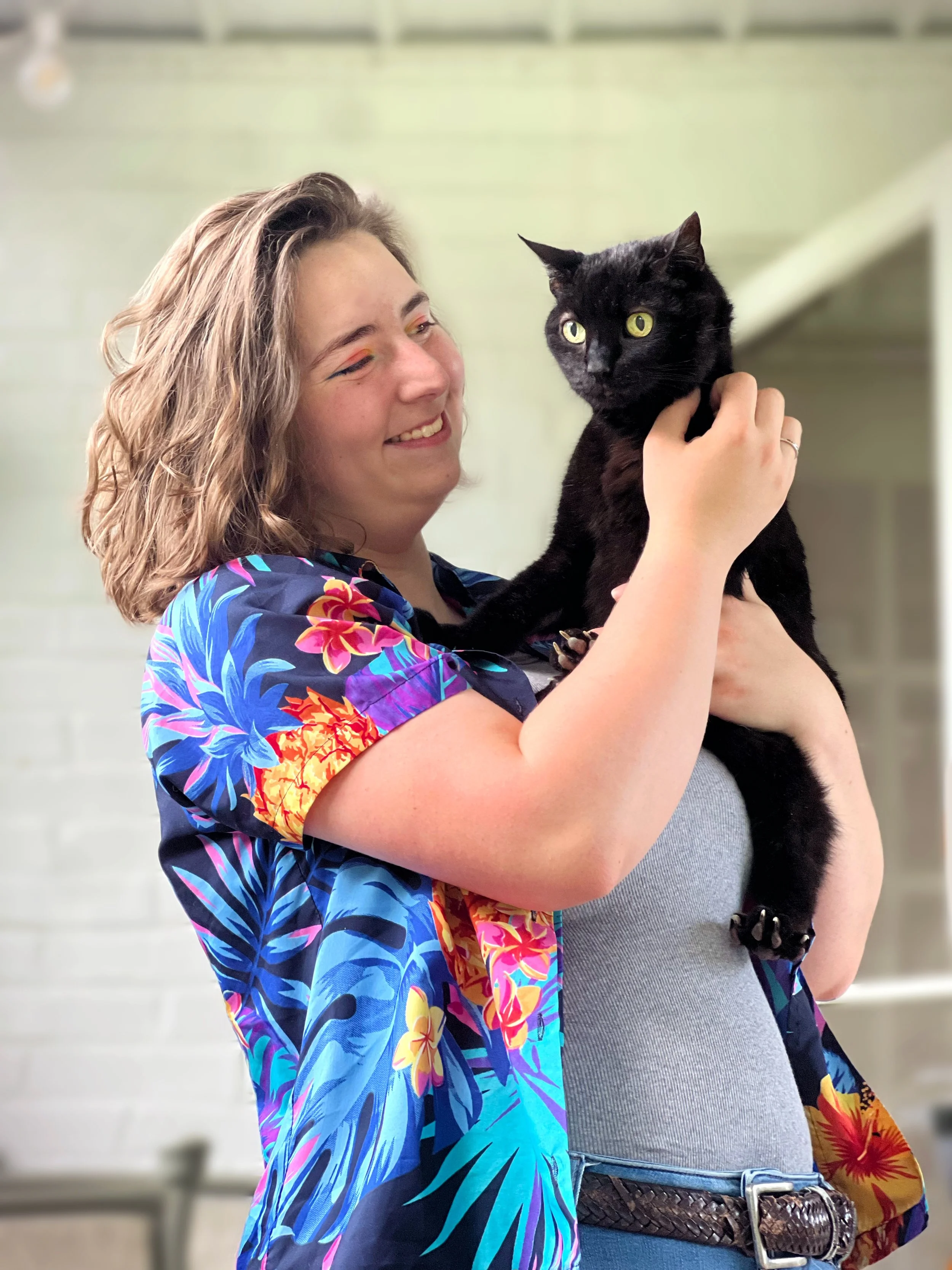 Meet Gabe – our “coffee nerd” barista, lifelong Roanoke local, and proud cat dad to Freya, Tater, Loktar, and Boo! When he's not crafting the perfect brew at The Toebean Cat Café, Gabe dreams of opening his own café, and enjoys stand-up comedy, cosplaying, gaming, and unwinding with his favorite TV shows. He loves nature and animals and is a super chill guy, so come by and say “hi” sometime!
